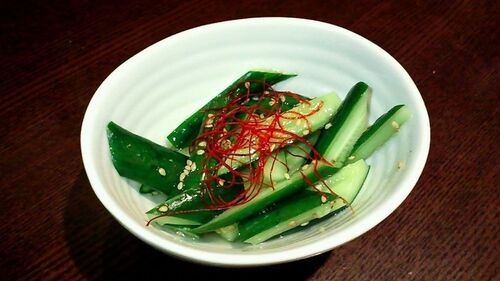ここの二階に呑みのスペースができたのは知っていたけど、 人数を揃える必要があるので、訪問はどうかな?と思っていたところ、 とある筋からの声掛けで七名程度で卓を囲むコトに。 当日は三時間呑み放題の 6,480円(税込)のコースを。 《突き出し①》 胡瓜…
