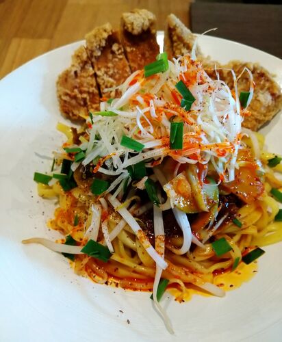 先月下旬にオープンの新店。 場所は【丸の内北口】に出て右手に高架沿いを暫し進んだ「味の散歩道」に入って直ぐ。 店内は厨房に向いたG字型十席のカウンターが二か所、二人掛けのテーブルが三卓。 カウンターは一席空けての案内。 11:15の入店で先客…