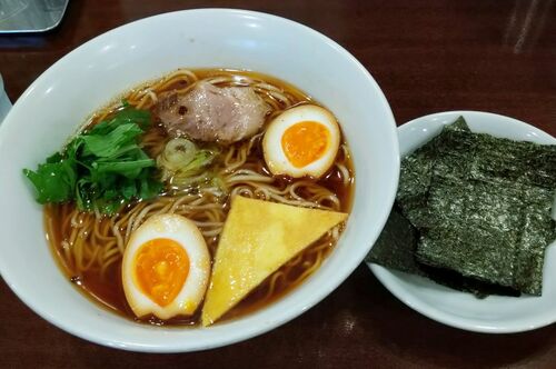 ほぼ十年振り、二度目の訪問。 予定していた店は日曜は営業をしていないようで、急遽近くに在る標題店に切り替える。 表通りにA看板も出されているし、路地からは煮干しの香りが漂ってくるのがなんとも心強い。 店内は厨房に向いた緩い く の字型五席と窓に…